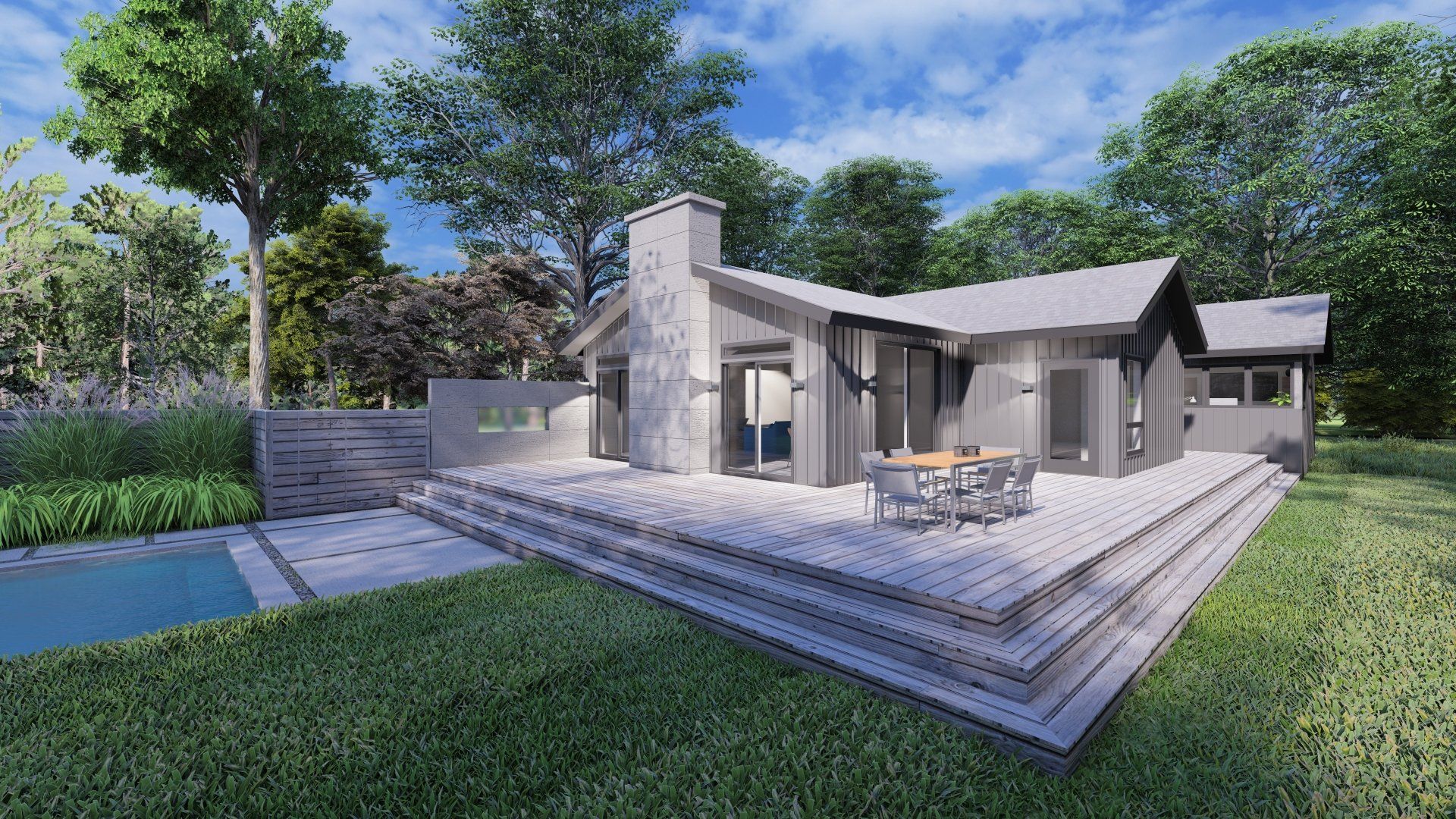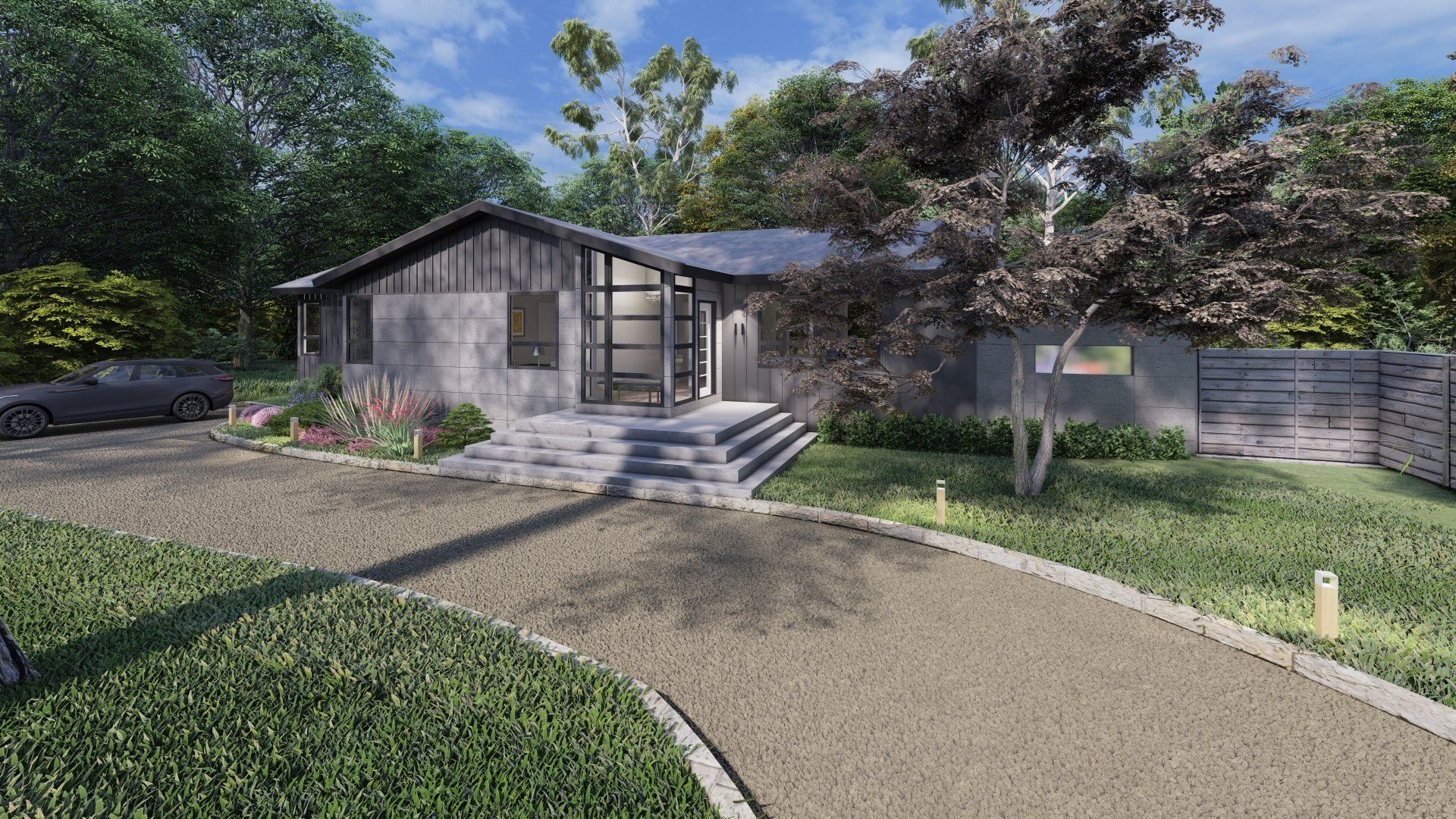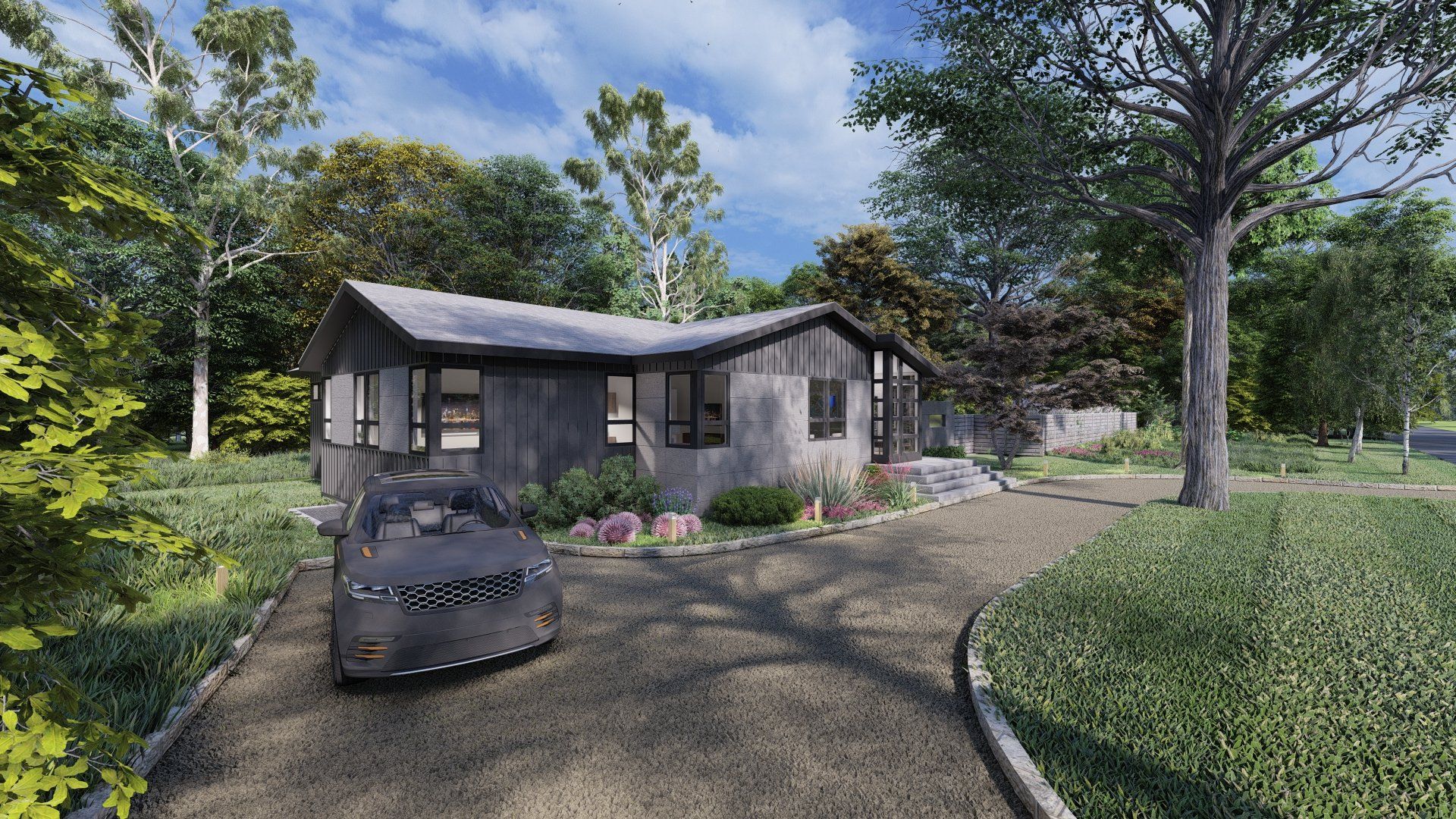 This project has currently been approved and will start construction April, 2021. The house was an existing ranch style where we are adding approximately 1,000 SF of living and sleeping spaces. The design intent was to keep the horizontally of the house and infuse a mid-century modern aesthetic.