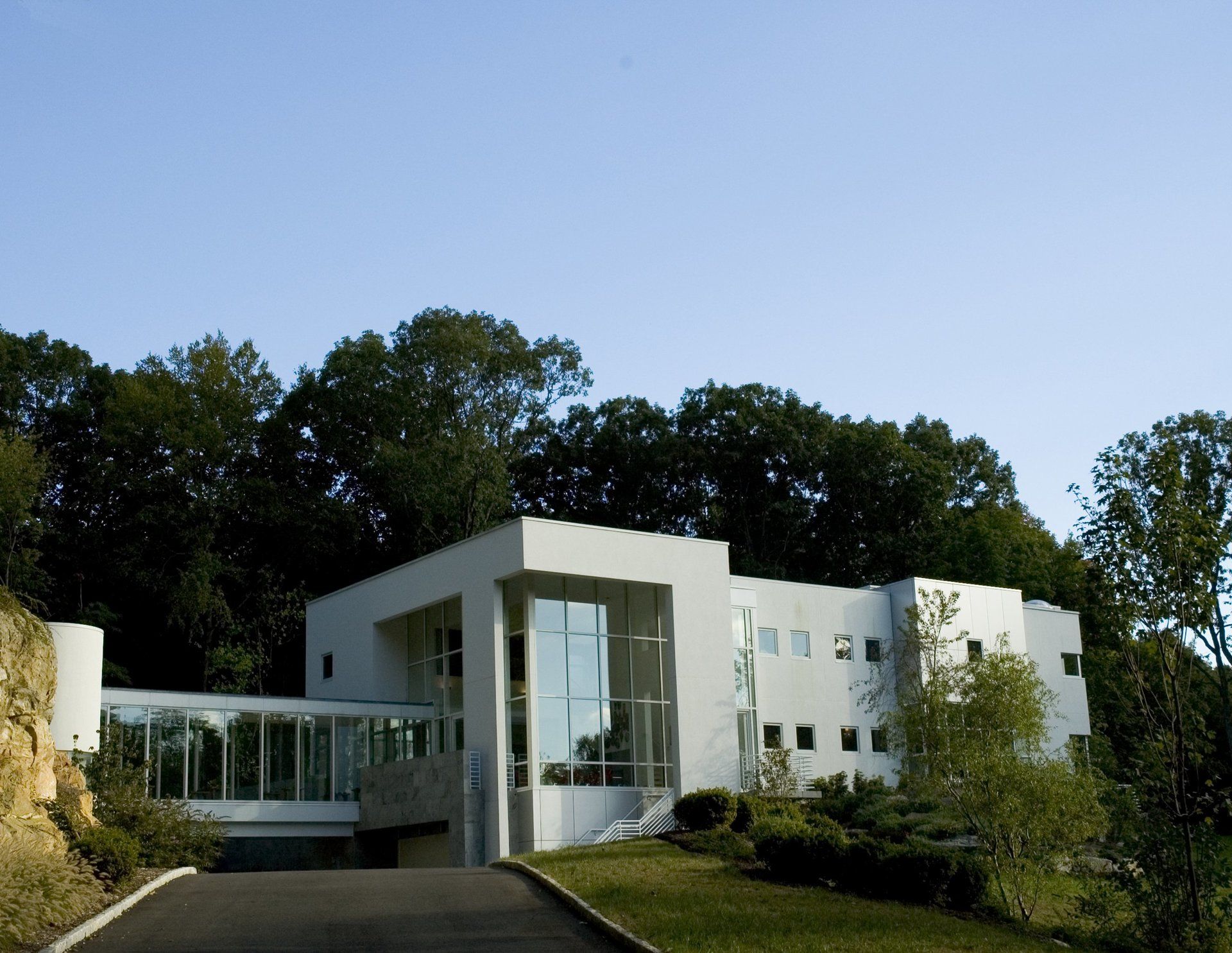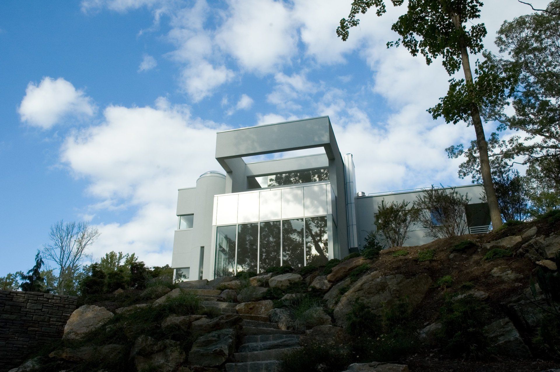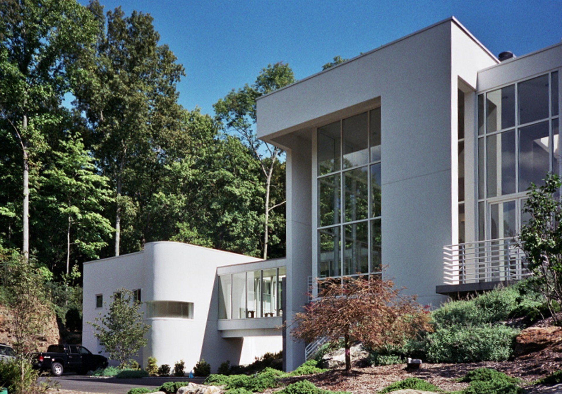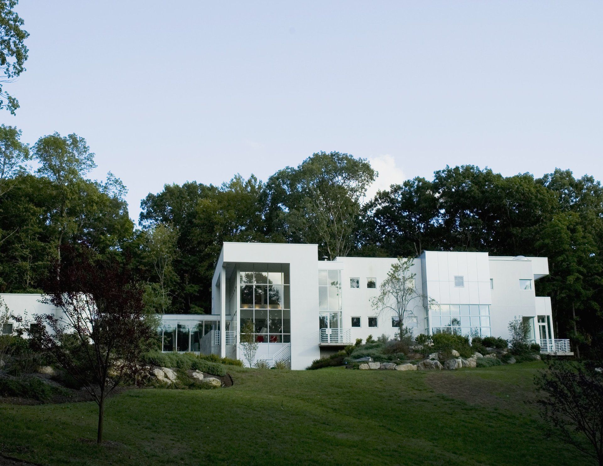 This 11,000 square foot home rests on a dramatically sloped 5 acre wooded site. The main house is connected to a guest wing by an enclosed bridge. A freestanding pool cabana complements the landscaping with a planted green roof.