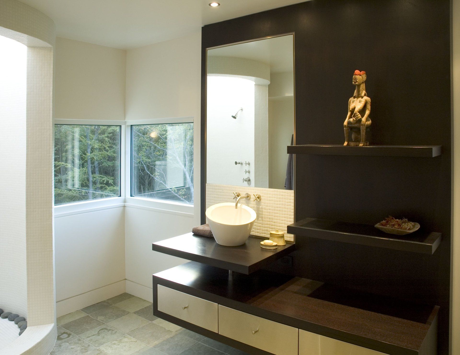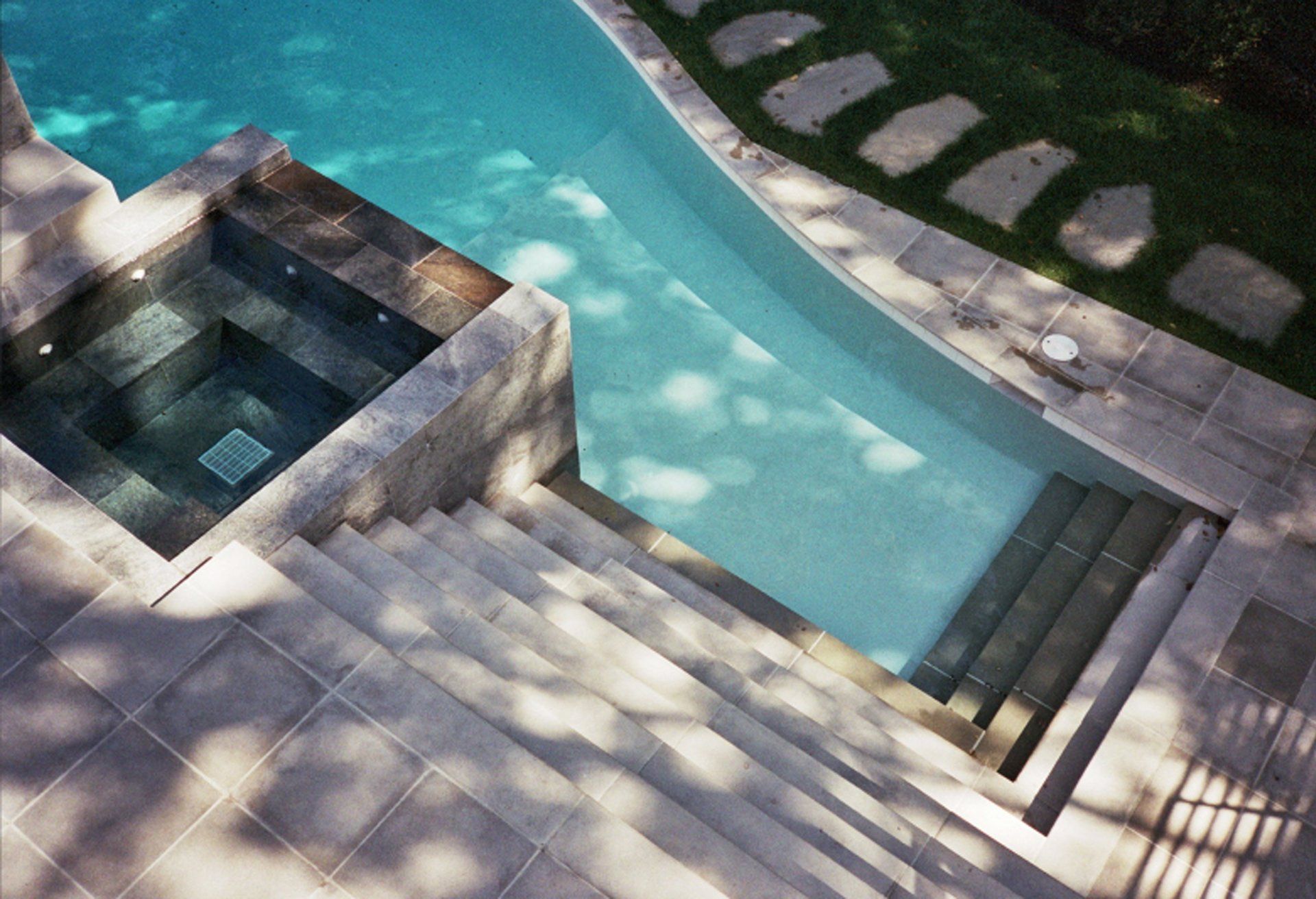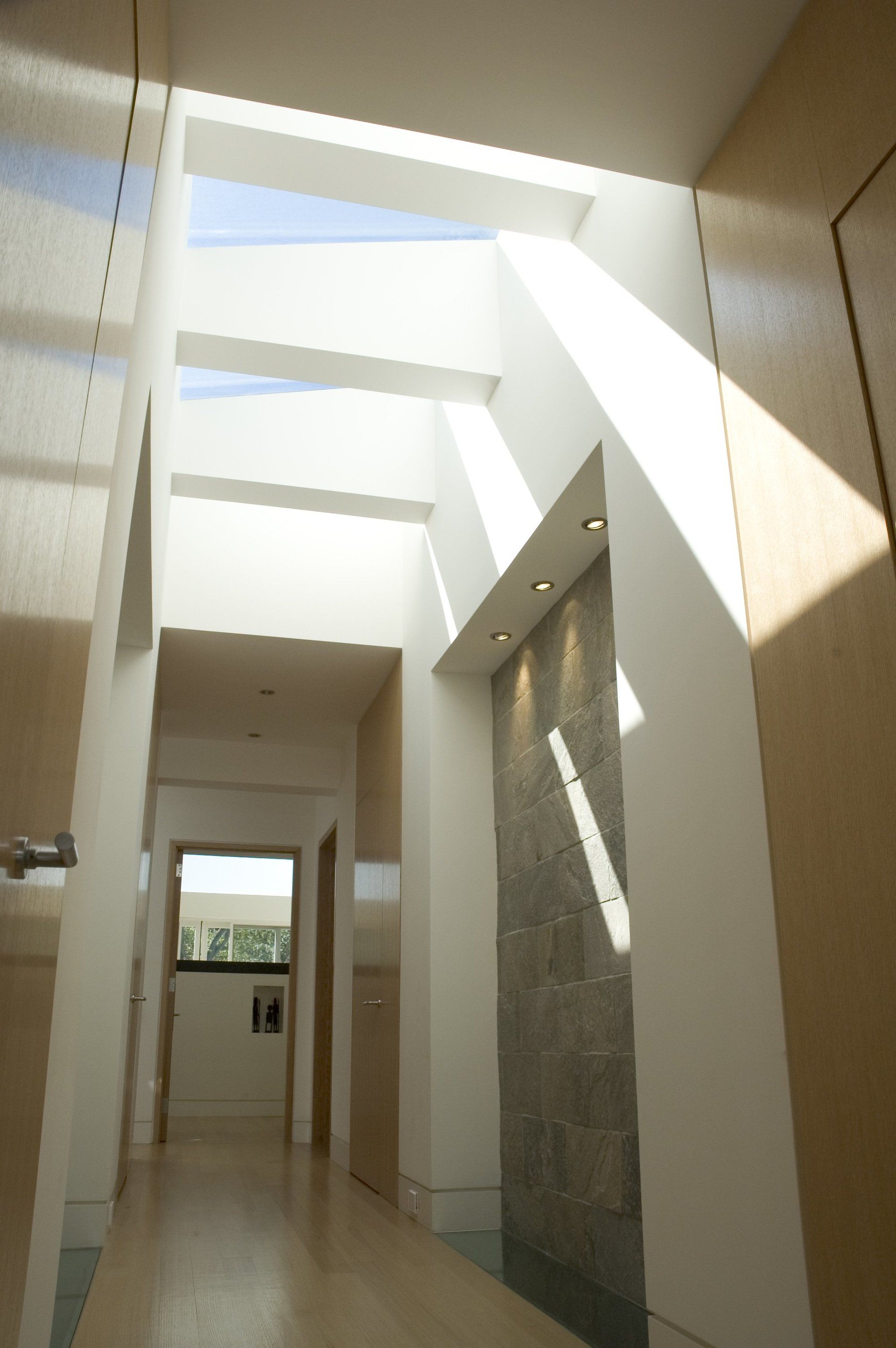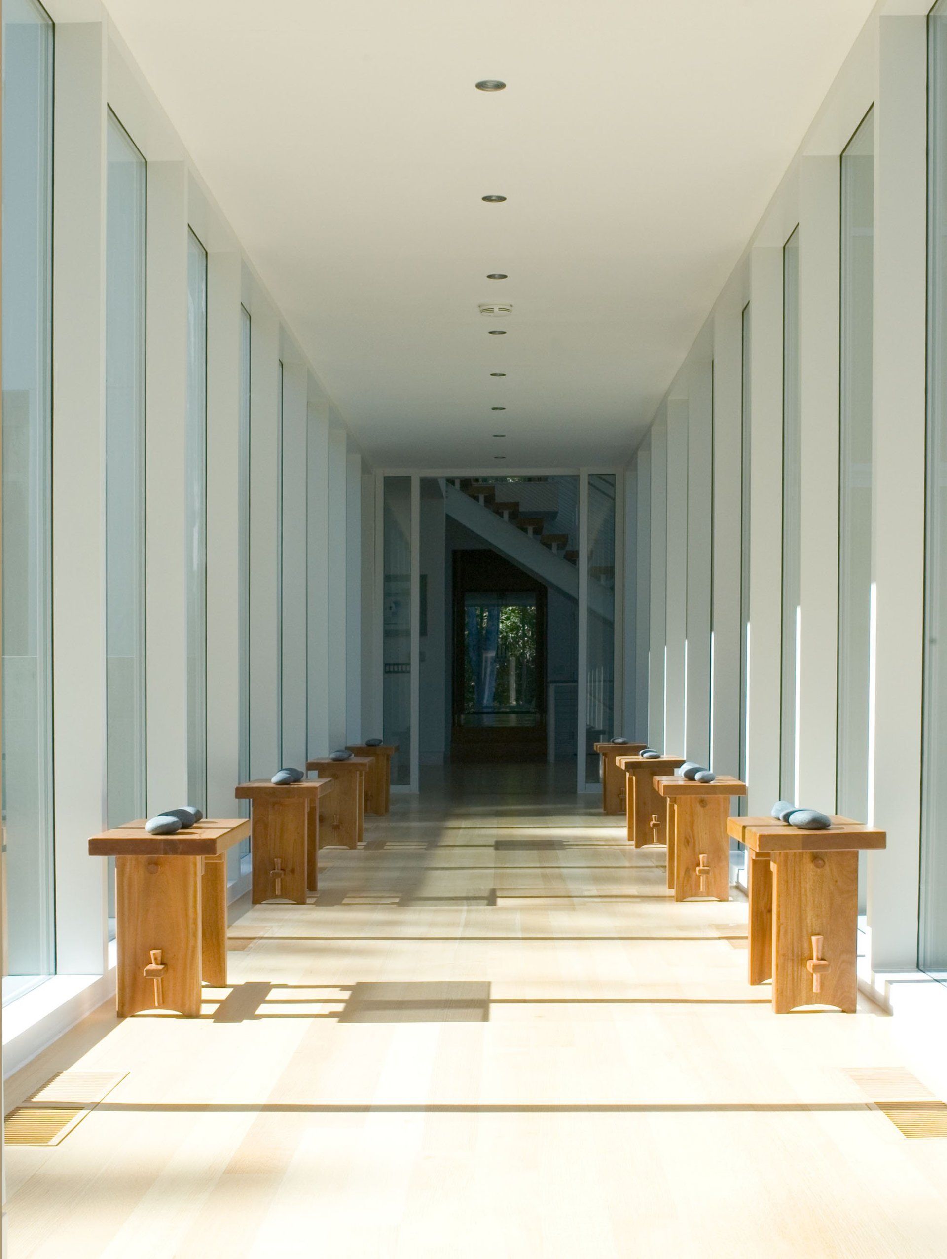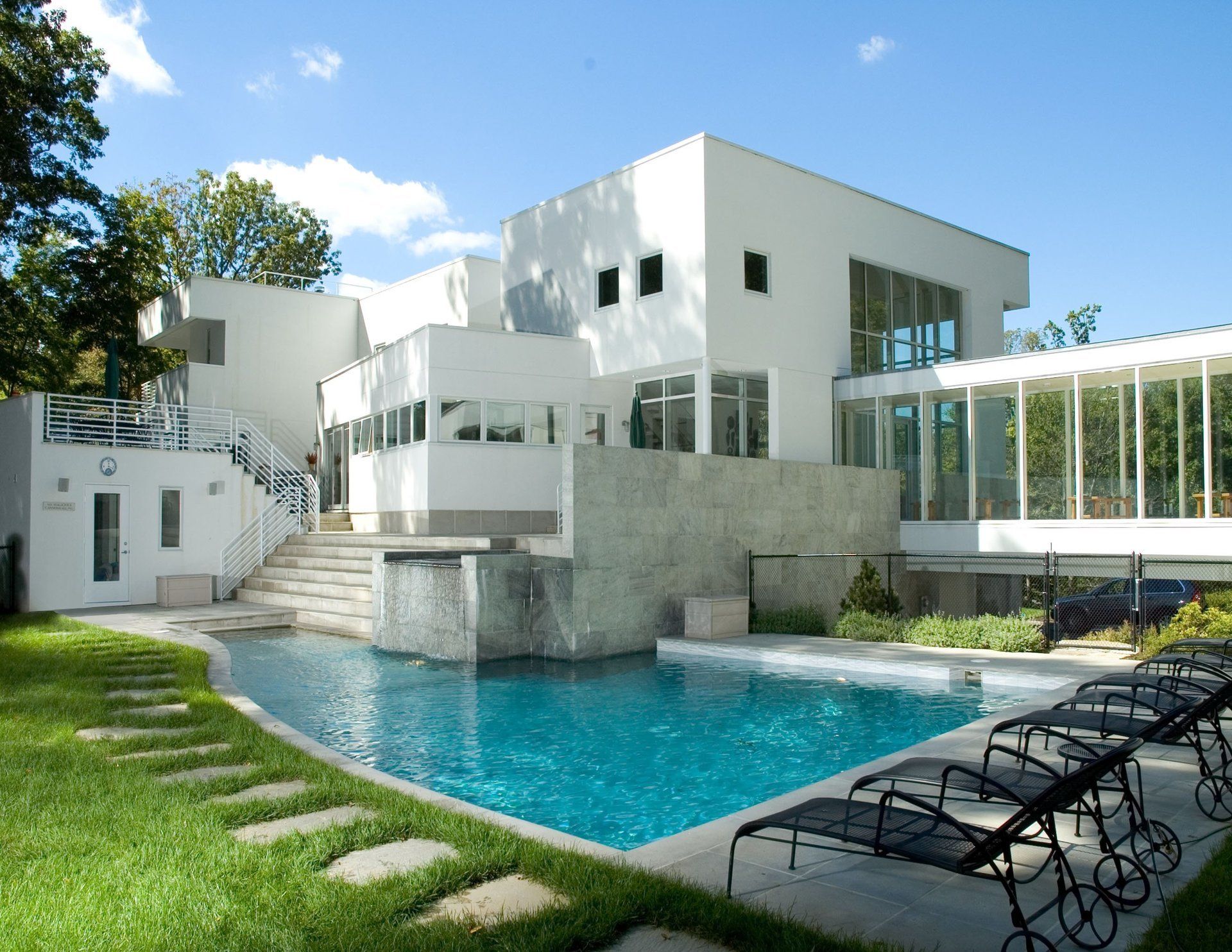 This 11,000 square foot home rests on a dramatically sloped 5 acre wooded site. The main house is connected to a guest wing by an enclosed bridge. A freestanding pool cabana complements the landscaping with a planted green roof.