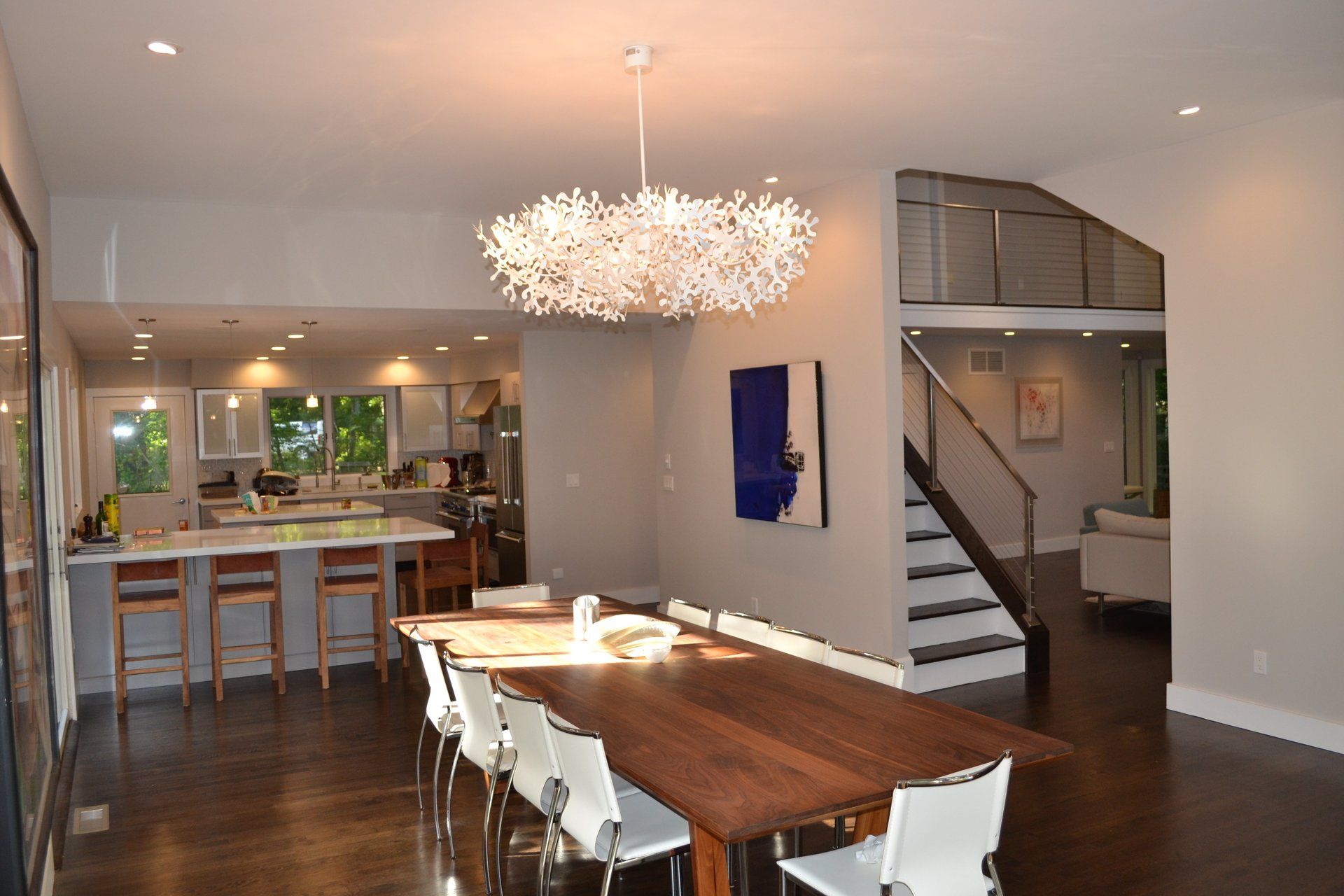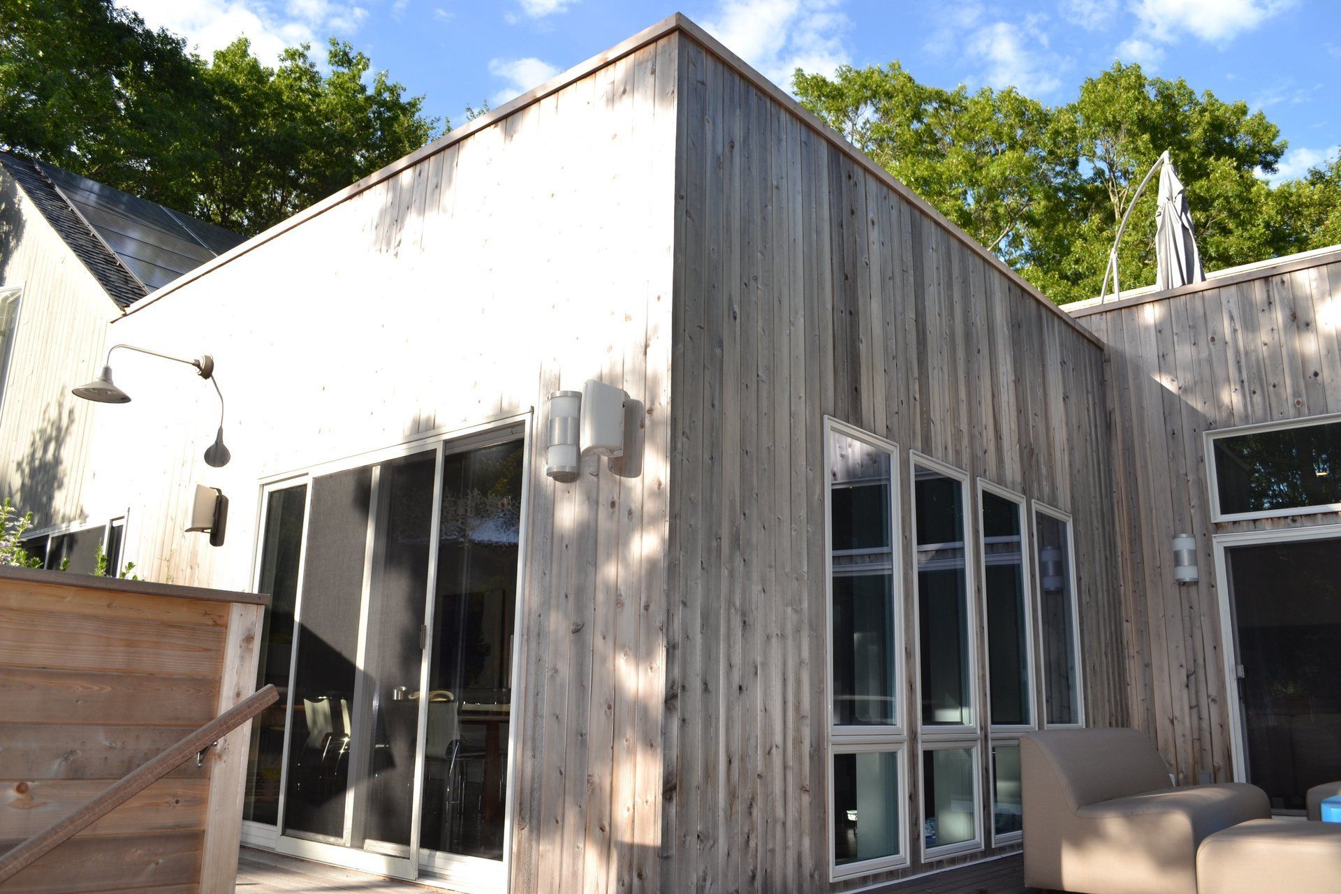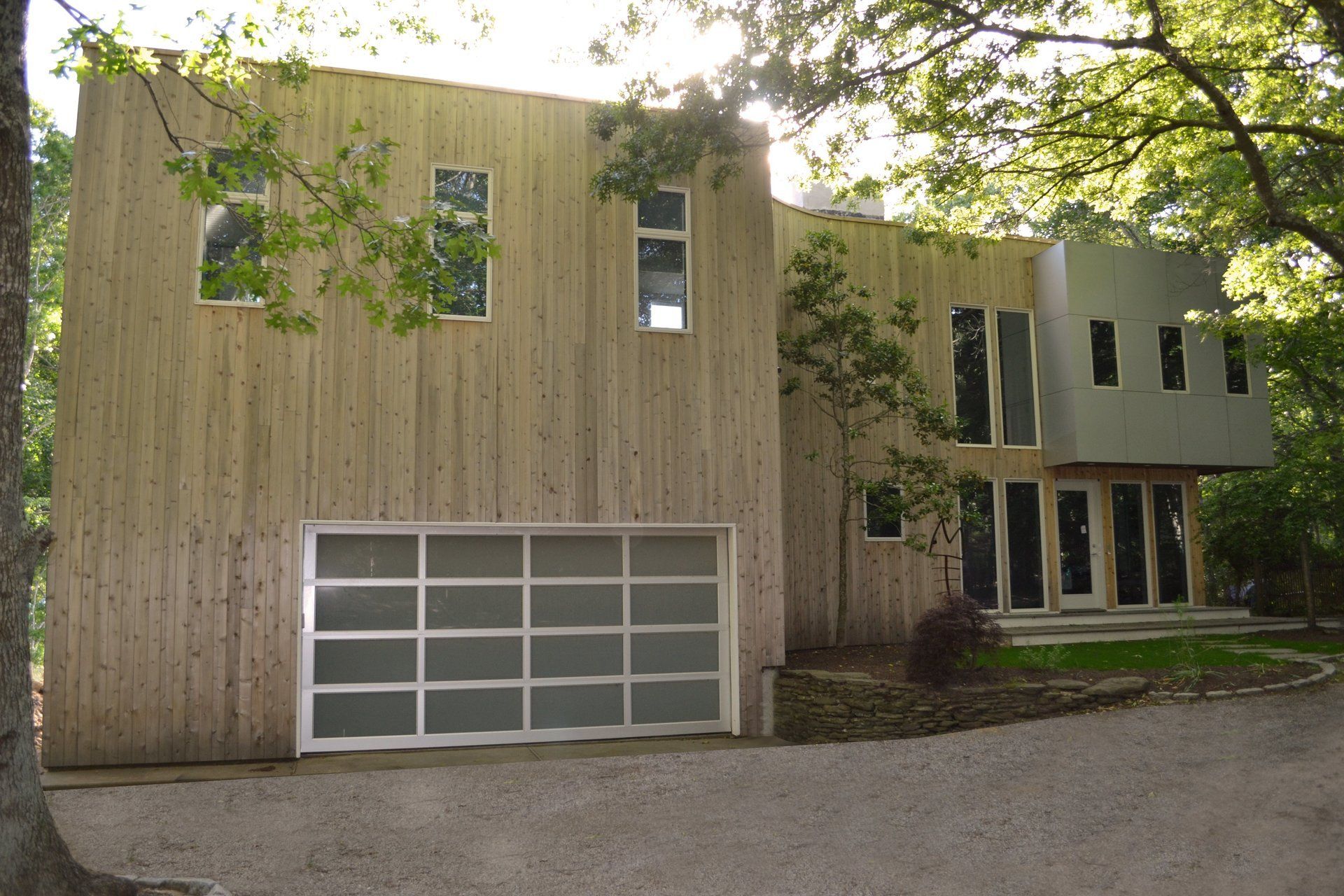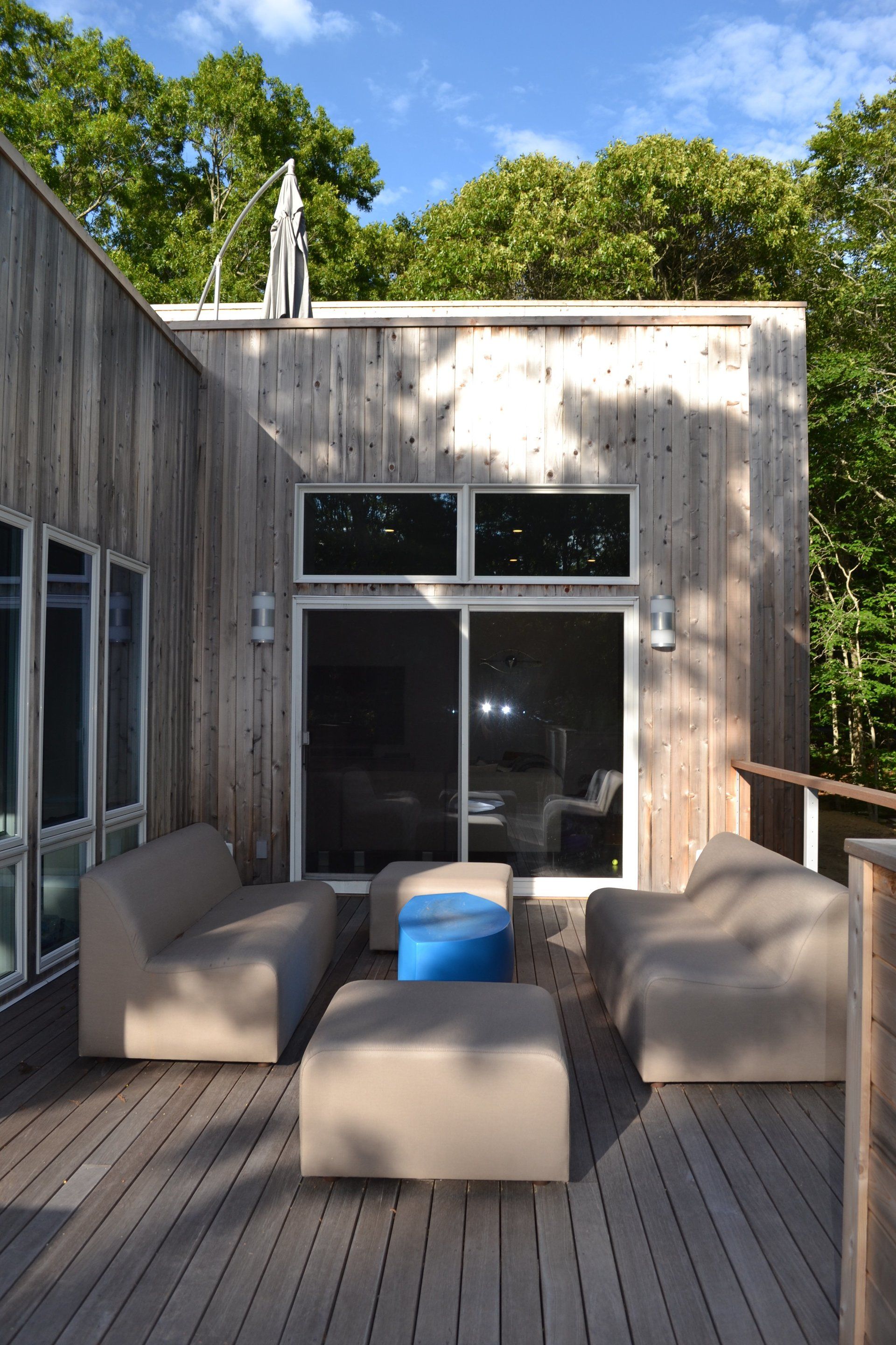This renovation/ addition transformed a small 1970's saltbox style house into a spacious weekend retreat for the clients where they could enjoy a private setting in the woods, yet still go to the beach a few minutes away. Large expanses of glass were used to bring the exterior inside.
