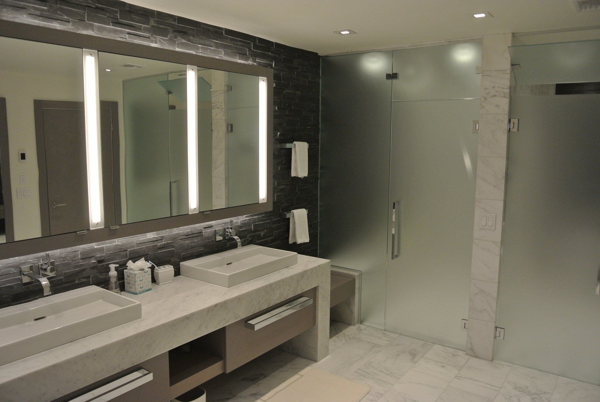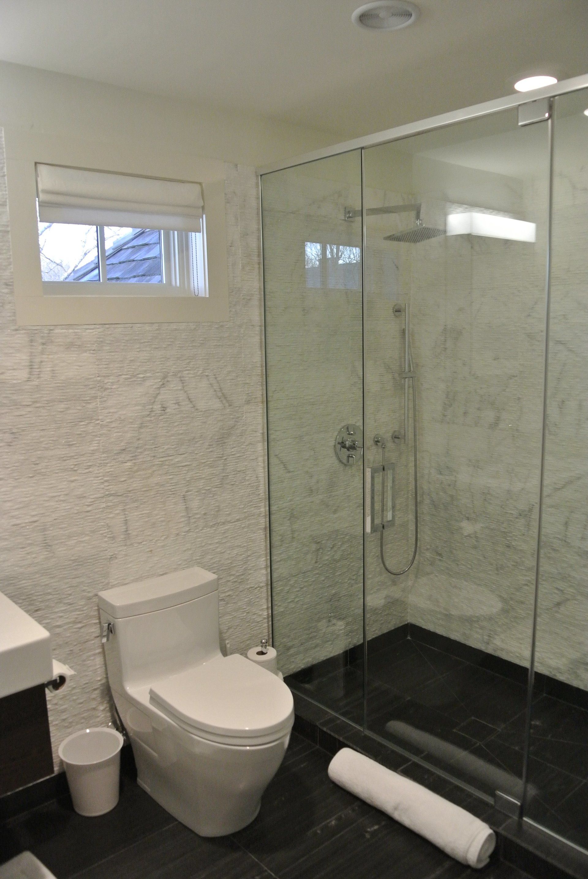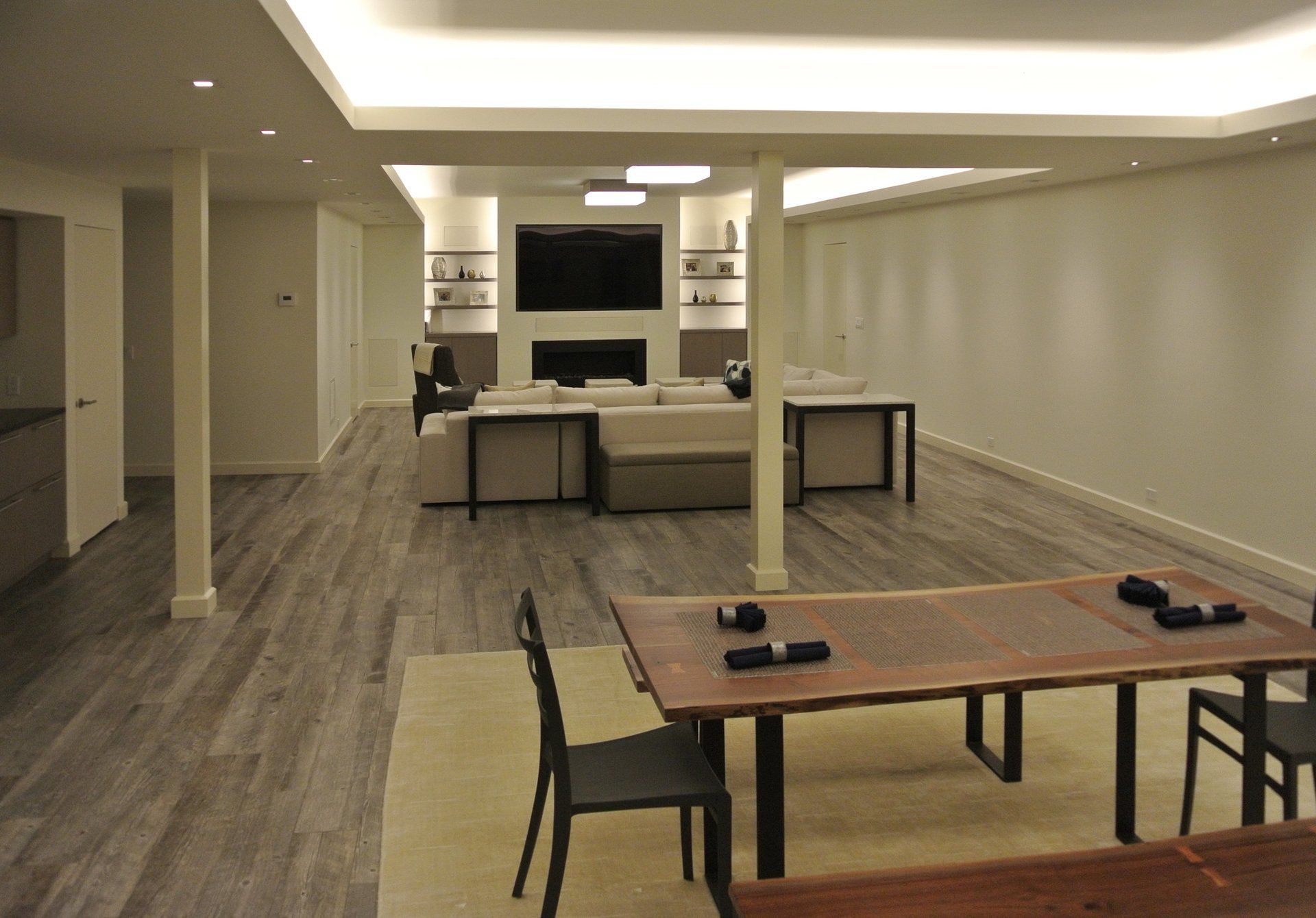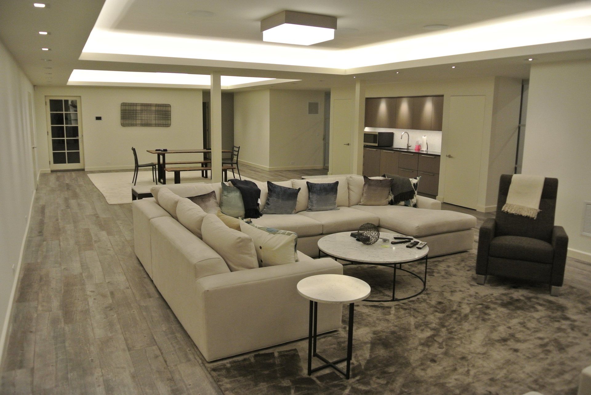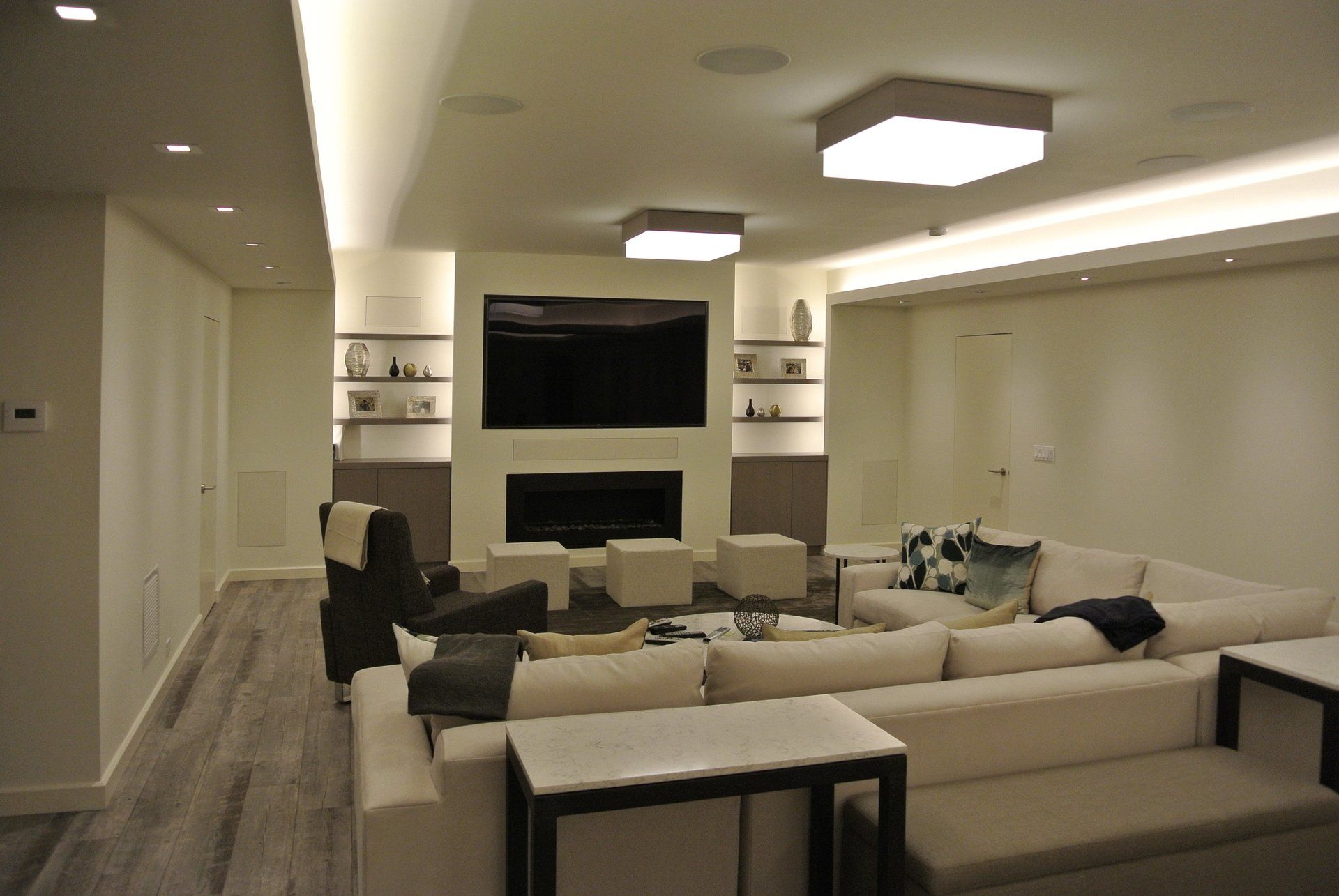 The unfinished basement to this home was developed to accommodate two new bedroom suites, a multi-purpose den, a gym with a climbing wall, and a refrigerated wine cellar. New lighting, clean lines, and interesting materials were used throughout. In addition, all seven of the existing bathrooms in the rest of the house were updated with new materials, lighting, and plumbing.