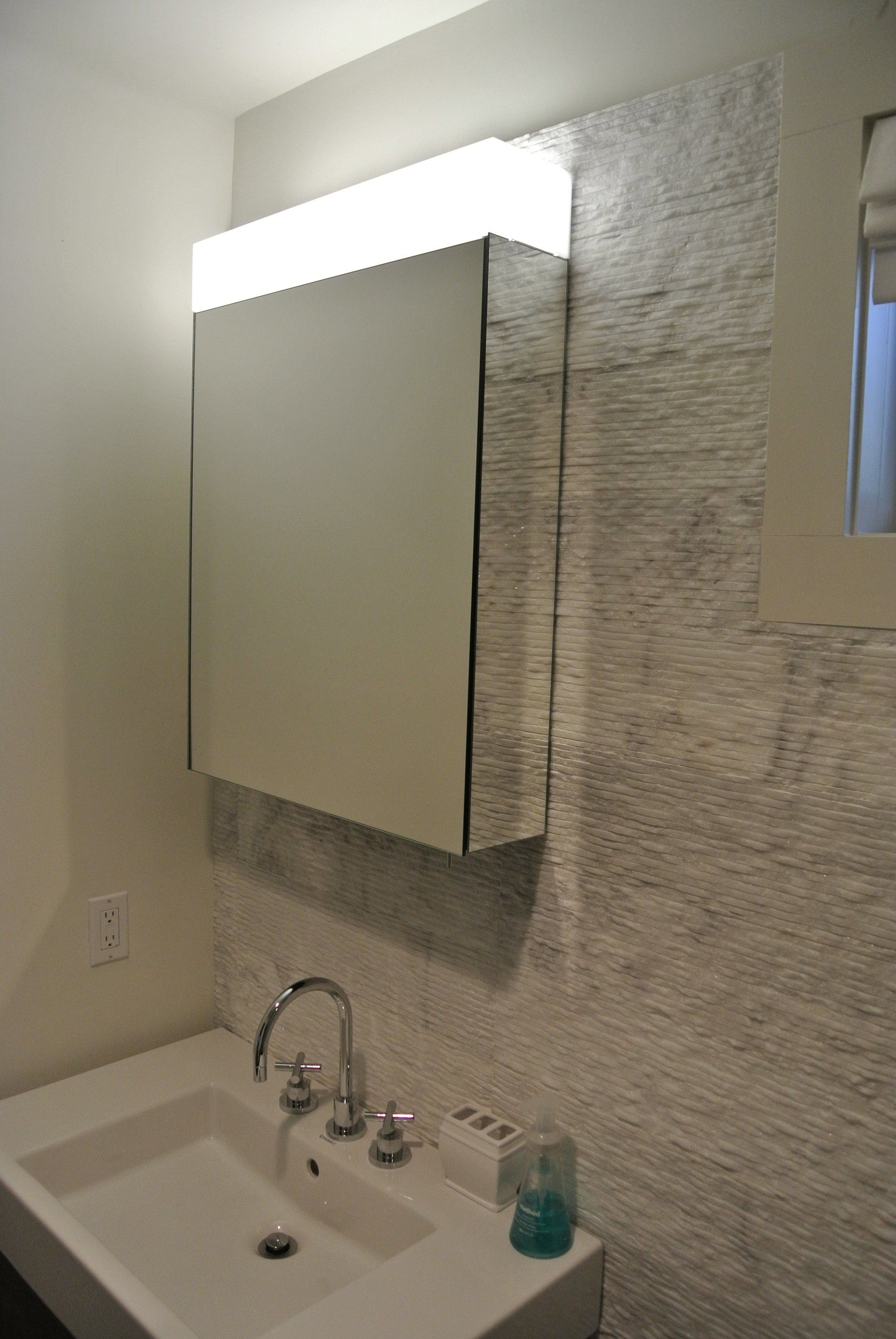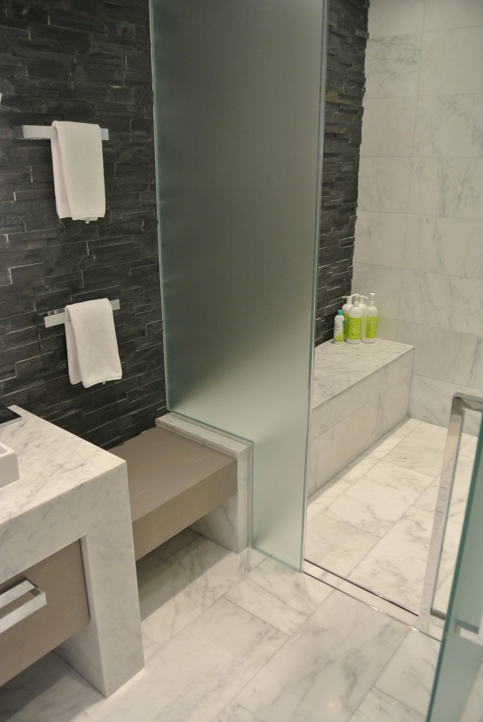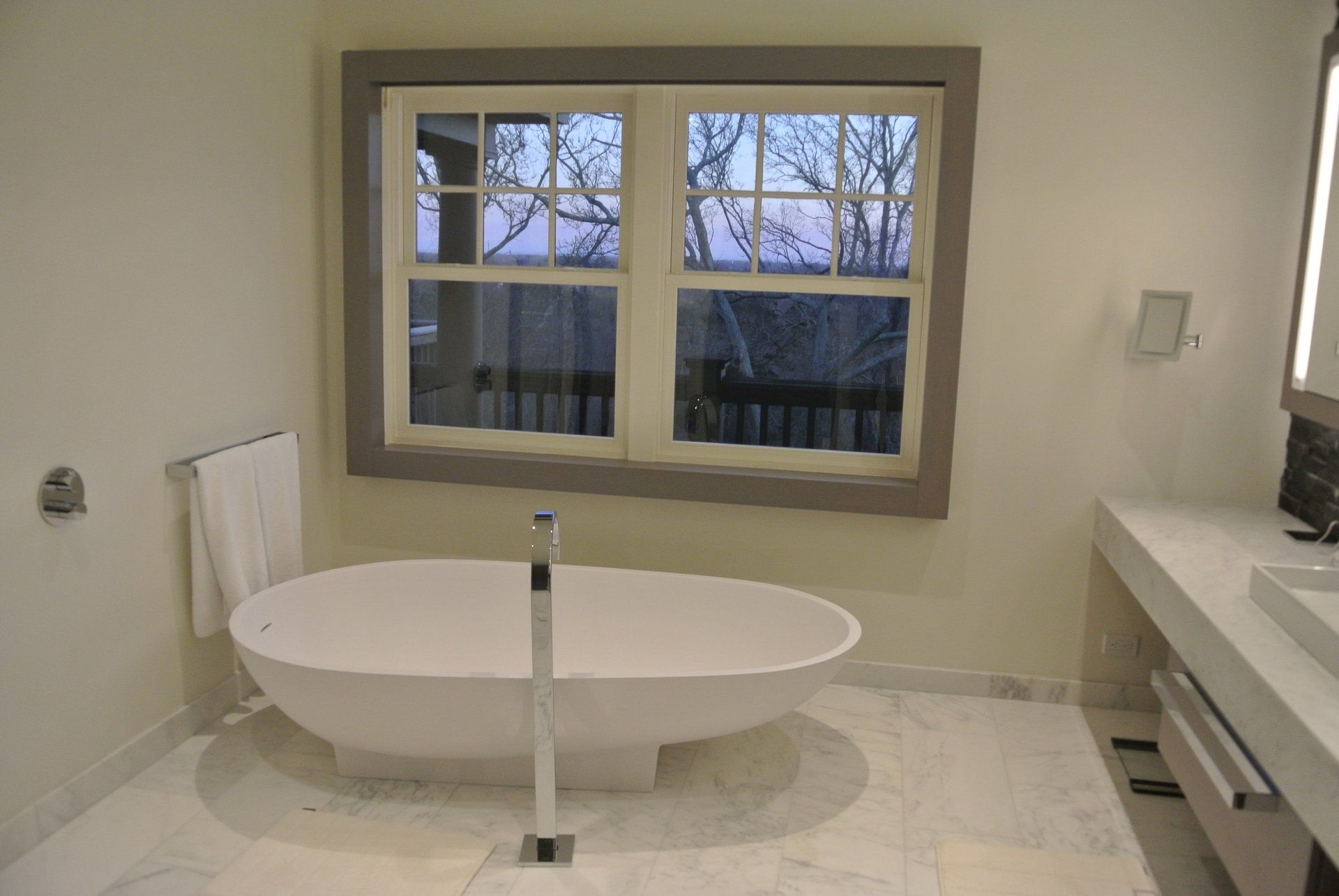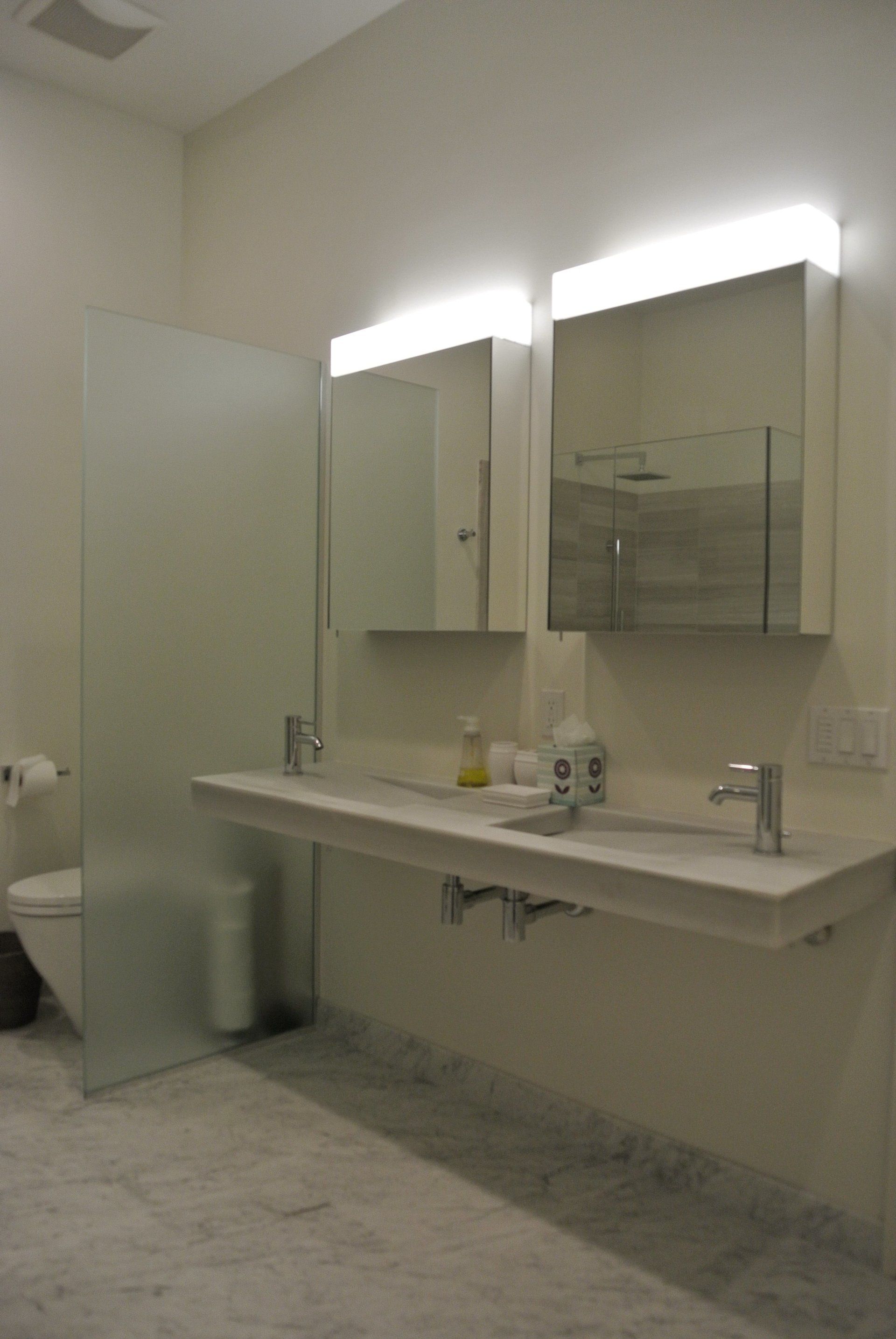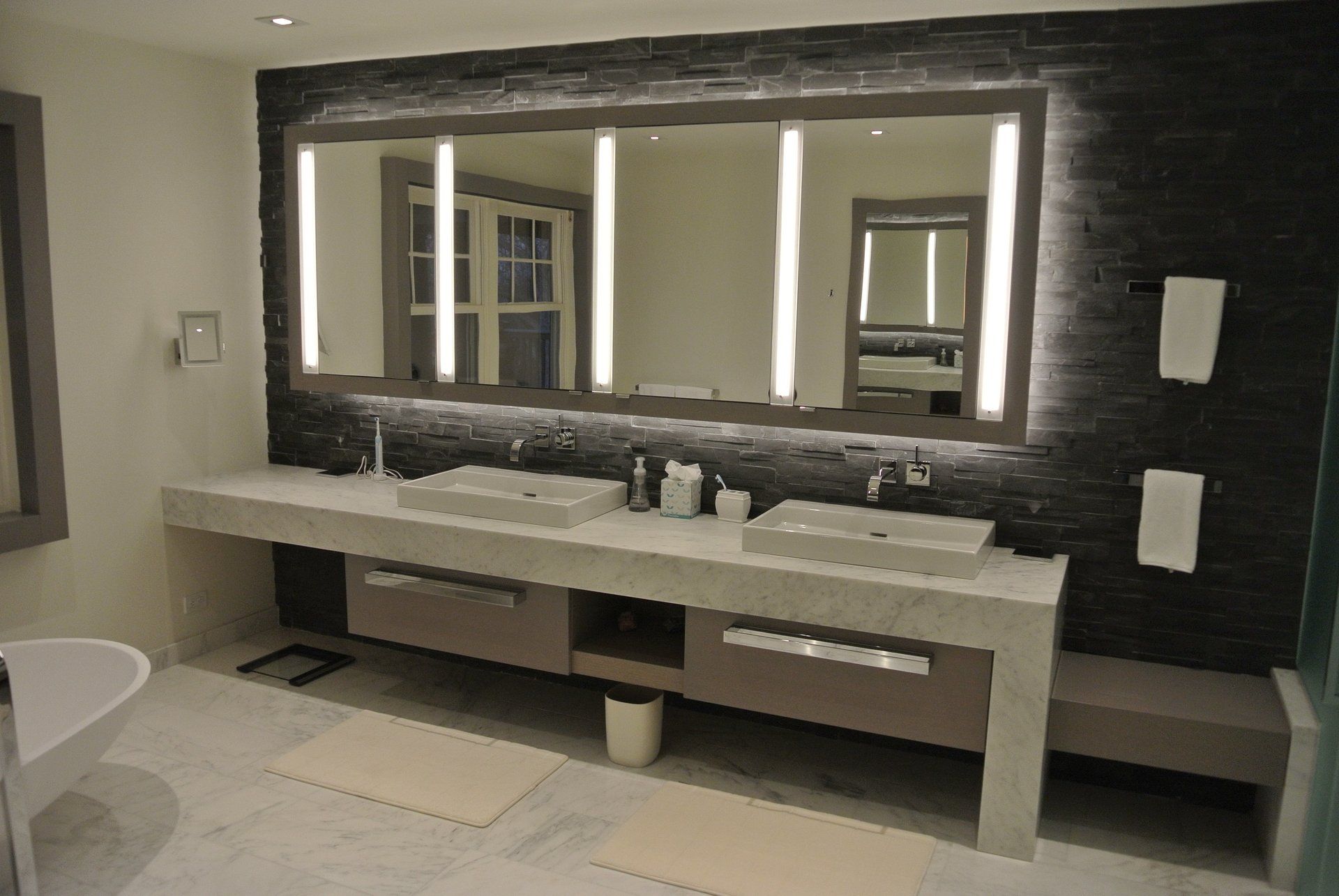 The unfinished basement to this home was developed to accommodate two new bedroom suites, a multi-purpose den, a gym with a climbing wall, and a refrigerated wine cellar. New lighting, clean lines, and interesting materials were used throughout. In addition, all seven of the existing bathrooms in the rest of the house were updated with new materials, lighting, and plumbing.